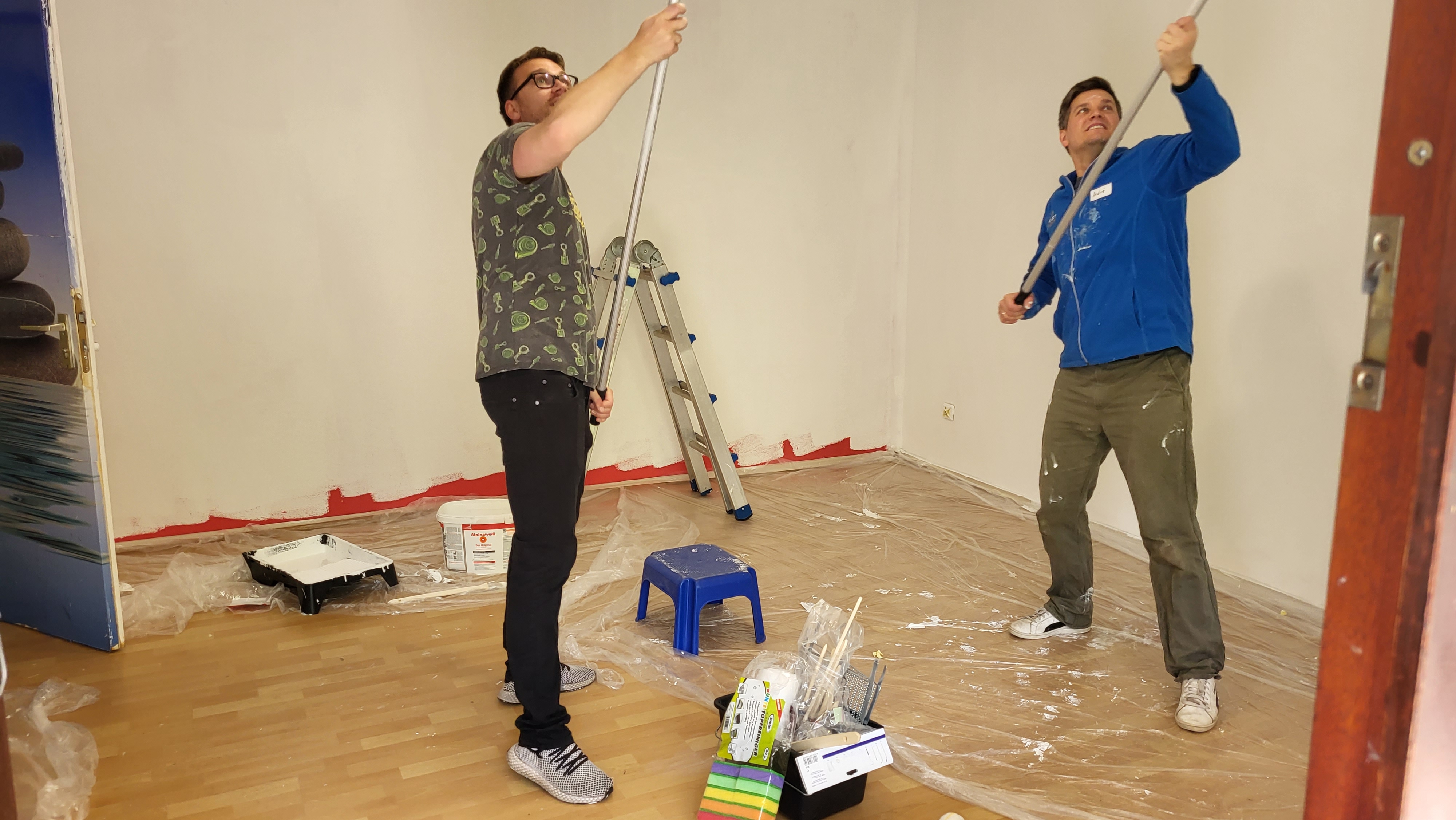 Hier hieß es für zwei Mitarbeiter Farbeimer und Pinsel in die Hände nehmen statt wie an anderen Arbeitstagen Smartphone und Tablet – und hinterher wahrscheinlich Fleckenentferner, denn ganz ohne Farbkleckser ging es nicht ab. Bei Malerarbeiten an Wänden und Decke zeigte sich, wer Erfahrungen als Heimwerker gesammelt hat. Kollegen und Kolleginnen aus dem Team 4 kümmerten sich zeitgleich um den Vorgarten, der von Ästen und Zweigen befreit werden musste.